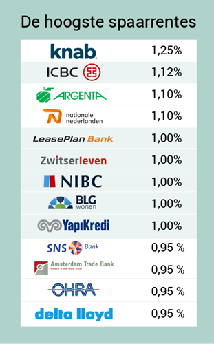 De hoogste spaarrente ontvang je op dit moment bij Knab (1,25 procent). Met 1,10 procent aan spaarrente volgen Argenta, ICBC en Nationale-Nederlanden. Het verschil met de grote banken is flink en dit zal ook zo blijven voorlopig.