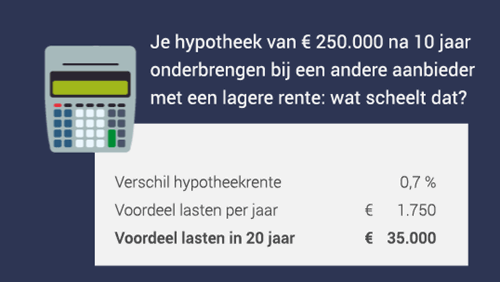 Wanneer je een hypotheek afsluit, spreek je met de bank af voor welke periode de hypotheekrente vast staat. Is de rentetermijn van bijvoorbeeld tien jaar verstreken, doet de bank je een nieuw voorstel. Het is niet waarschijnlijk dat jouw bank op dat moment het voordeligst is. Zonder te vergelijken ingaan op dit voorstel is dan ook niet verstandig. Je loopt daarmee het risico op fors hogere hypotheeklasten dan noodzakelijk.