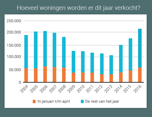 In de eerste vier maanden van dit jaar zijn ruim 25% meer woningen verkocht dan in dezelfde periode vorig jaar. Het is altijd afwachten hoe het aantal woningverkopen zich verder ontwikkelt, maar voorlopig lijkt het erop dat we dit jaar op een recordaantal verkopen afstevenen. Goed nieuws voor iedereen die zijn huis dit jaar wil verkopen.