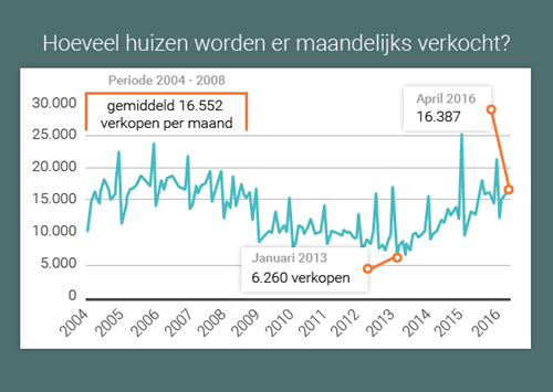 Zoals je ziet kent het aantal woningverkopen een behoorlijk grillig verloop. Dat komt omdat we als woningkopers zeer gevoelig zijn voor invloeden van buitenaf, zoals besluiten en maatregelen in de politiek of de financiële sector.