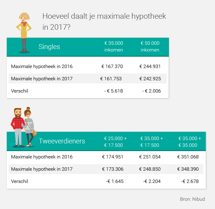 Net als in voorgaande jaren daalt de leencapaciteit. Je hebt in 2017 dus meer inkomen nodig om hetzelfde bedrag te kunnen lenen als in 2016. Vooral single starters zien hun budget voor een koophuis volgend jaar teruglopen. Je kunt bovendien minder lenen. Dit jaar mocht je nog 102 procent van de woningwaarde lenen, volgend jaar nog maar 101 procent. Je moet dus meer eigen geld meenemen.