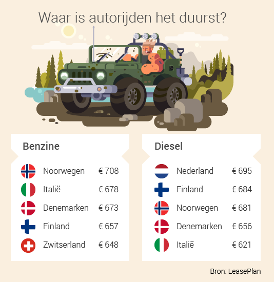 Nederlandse dieselrijders hebben de hoogste autolasten van Europa. Heb je een diesel, dan ben je maandelijks gemiddeld € 695 aan je auto kwijt, blijkt uit onderzoek van LeasePlan. Nederlandse benzinerijders horen ook bij de big spenders van Europa. Waarom autorijden hier zo duur is? Voornamelijk belastingen.