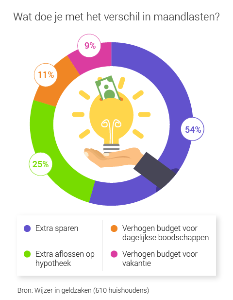 Platform Wijzer in geldzaken stelde meerdere vragen aan 510 huizenbezitters van wie de rentevaste periode in 2016 afliep. Bijvoorbeeld over het verschil in maandlasten. Huiseigenaren betaalden door de gedaalde rente gemiddeld in € 150 minder aan rentelasten.