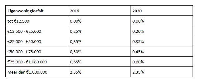 Eerder stipten we het al kort aan, in 2020 daalt het percentage voor de eigenwoningforfait met 0,05 procent. Dit geldt voor woningen met een waarde tussen de €50.000 en €1.080.000. Op zichzelf goed nieuws. De kans is alleen groot dat je er in de praktijk weinig van merkt. Het tarief wordt gebaseerd op de WOZ-waarde. Die waarde is fors gestegen.