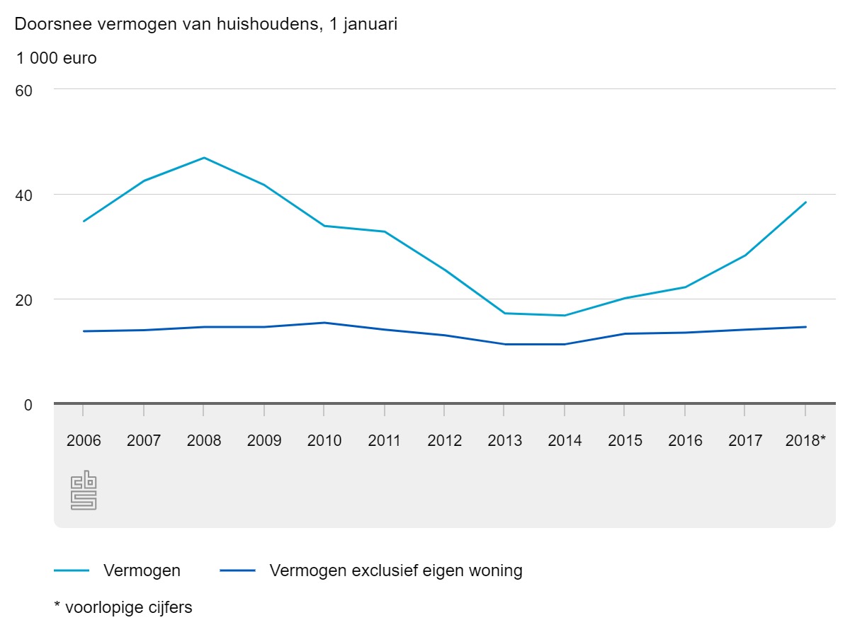 In 2018 hadden Nederlandse huishoudens een doorsnee vermogen van 38,4 duizend euro. Ten opzichte van een jaar eerder lag dit vermogen 10 duizend euro hoger. Dit was overigens niet direct terug te zien op de bankrekening. De stijging komt vooral door de waardestijging van woningen. Zonder het meerekenen van de woningwaarde wordt het verschil nog groter. Wel ligt het doorsnee vermogen in dat geval nipt lager dan in 2010.