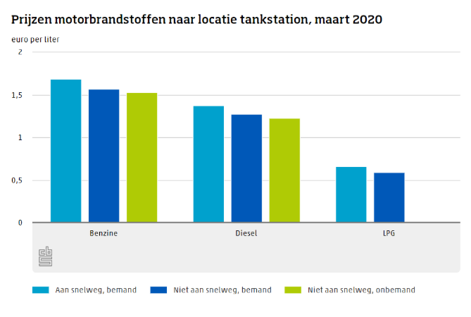 Prijzen van brandstoffen hangen ook af van de locatie van de pomp. Zo zijn tankstations langs de snelweg duurder dan stations die niet aan de snelweg liggen. Het prijsverschil tussen snelwegstations en bemande stations die niet aan de snelweg liggen was in maart 2020 per liter benzine iets meer dan 11 eurocent. Onbemande stations zijn gemiddeld het goedkoopst. Lagere personeelskosten spelen daarin waarschijnlijk een rol. LPG is uit veiligheidsoverwegingen niet verkrijgbaar bij onbemande tankstations.