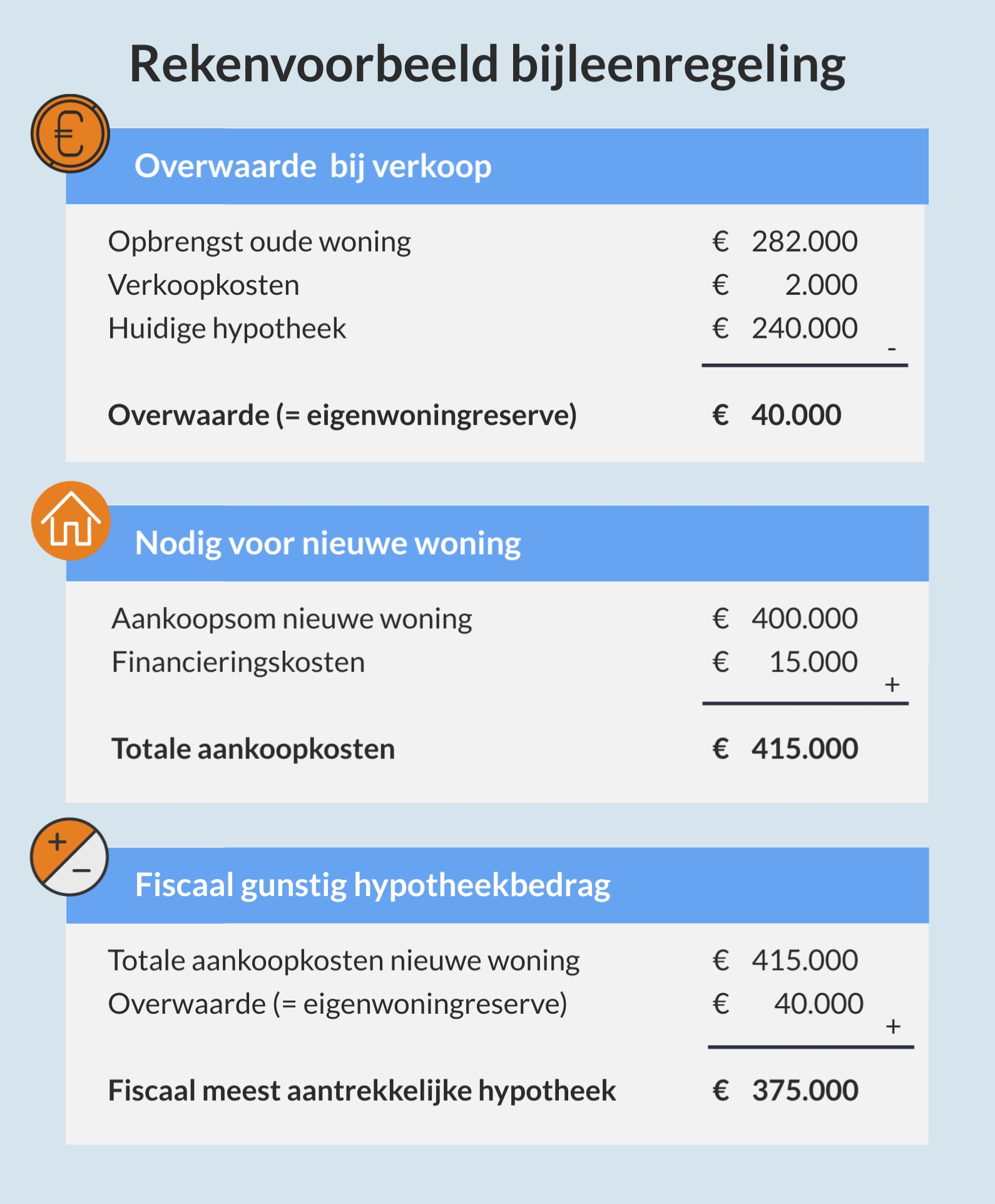 Josefien heeft haar woning verkocht en heeft een overwaarde van € 40.000. Ze koopt vervolgens een woning van € 415.000, inclusief aankoopkosten. Om maximaal te profiteren van de hypotheekrenteaftrek moet ze een hypotheek afsluiten van € 375.000.