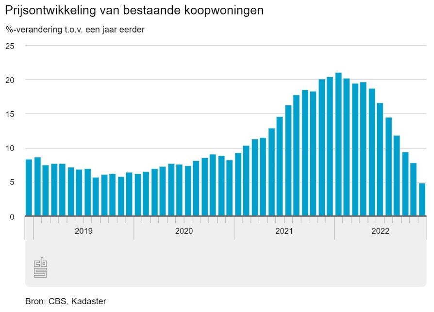 De tijd dat de woningmarkt record op record verbrak, is voorlopig verleden tijd. Dit blijkt uit de meeste recente data van het Centraal Bureau voor Statistiek (CBS). Een stijging van 4,9% op jaarbasis verbleekt bij de 21,1 die begin van het afgelopen jaar nog werd gemeten. Pas in september kwam de stijging onder de tien procent, wat normaal gesproken overigens al een uitzonderlijk grote toename is.